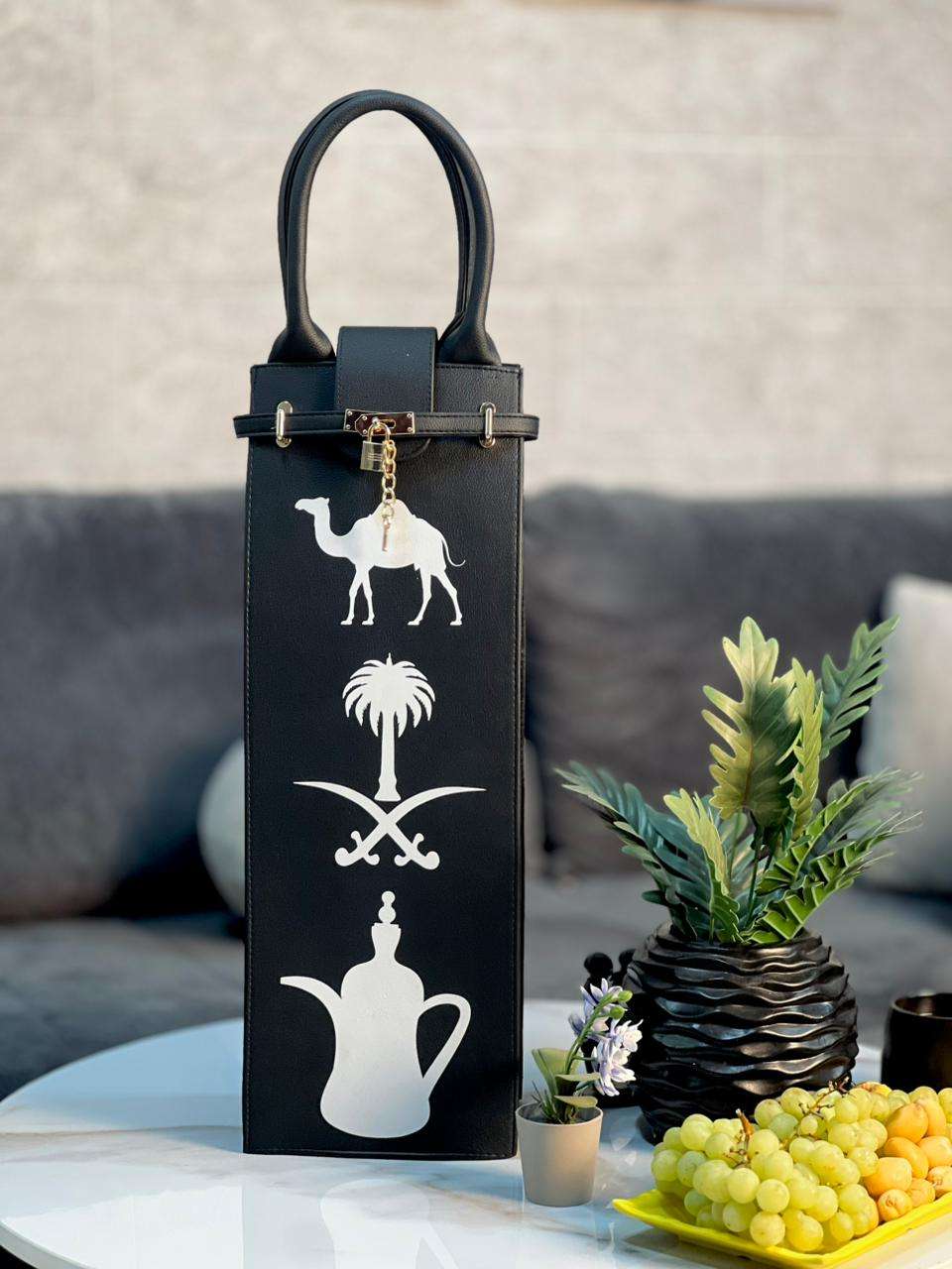 مصنوعة من الجلد التجاري لون اسود مطبوع عليها سيفان ونخلة مع جمل وترمس قهوة عربية