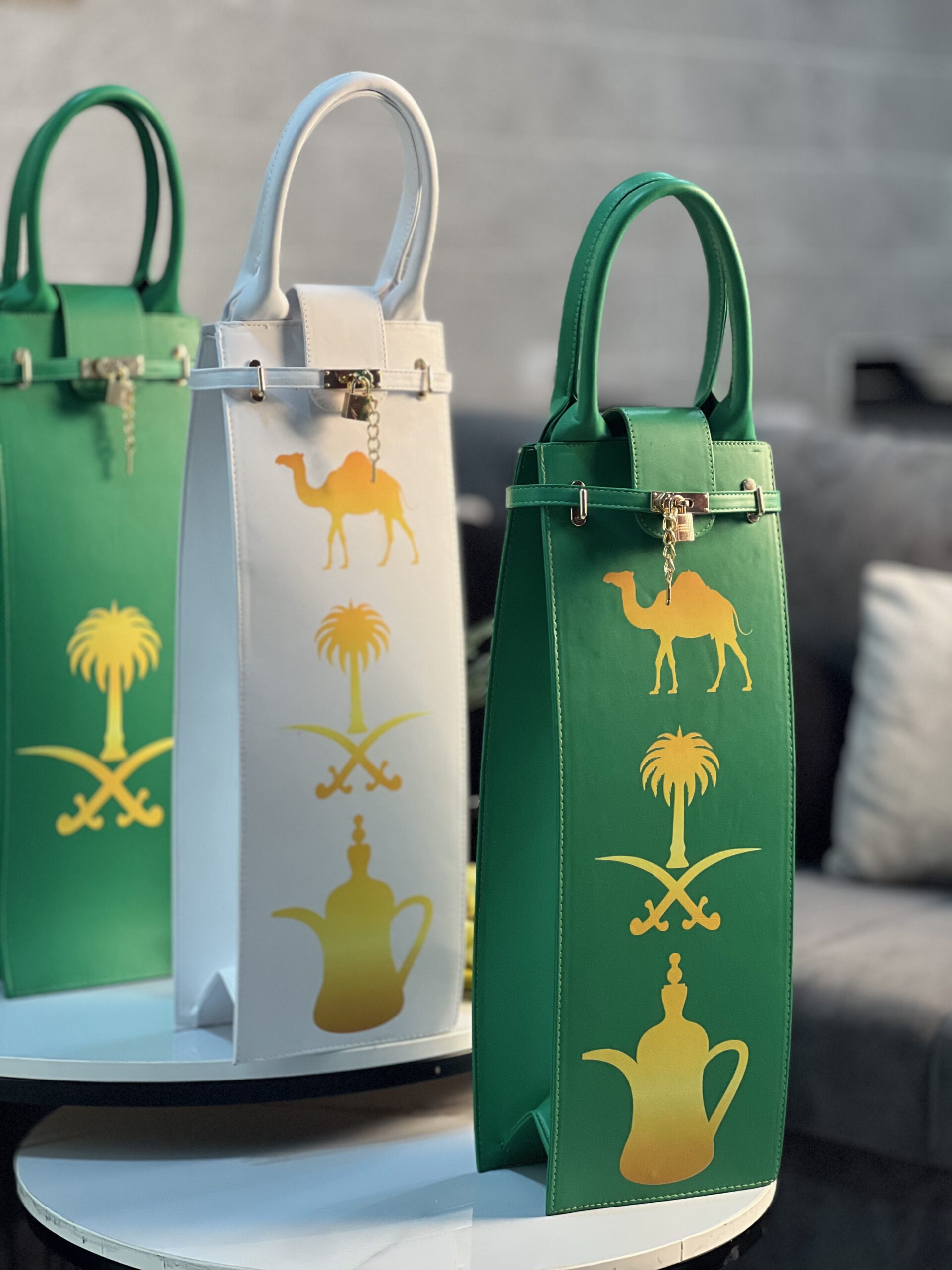 مصنوعة من الجلد التجاري لون اخضر مطبوع عليها سيفان ونخلة ع جمل وترمس قهوة عربية